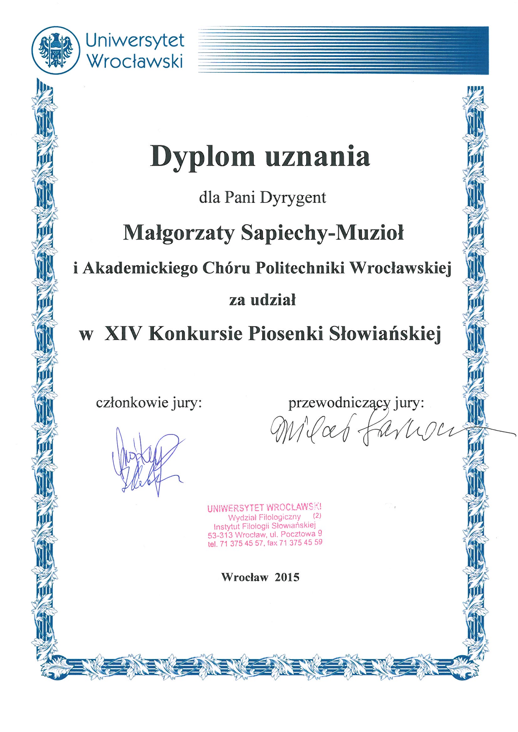 Akademicki Chór Politechniki Wrocławskiej wystąpił 25 maja w Oratorium Marianum Uniwersytetu Wrocławskiego jako gość specjalny 14. edycji Konkursu Piosenki Słowiańskiej.