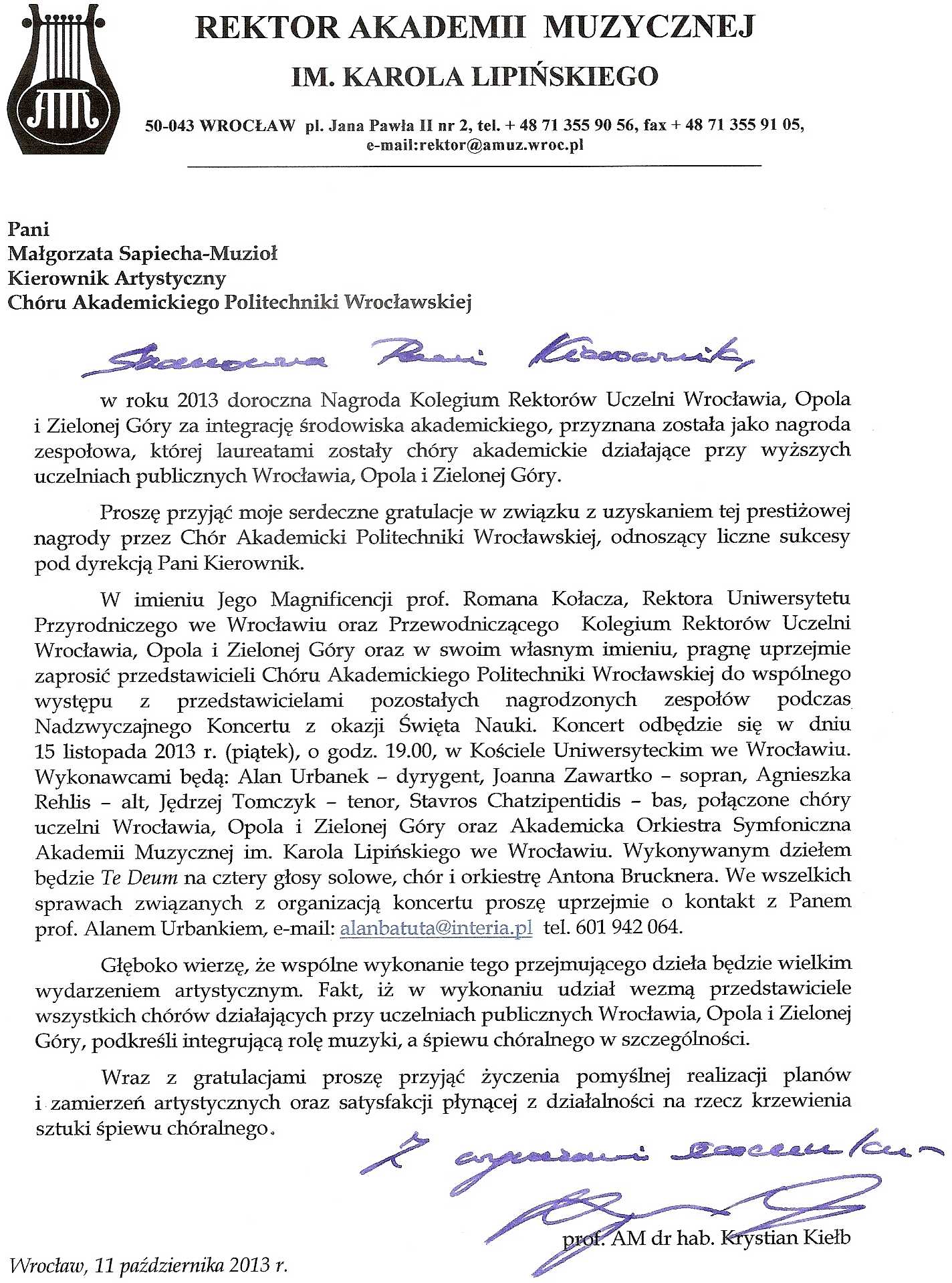 Z radością informujemy, że Akademicki Chór Politechniki Wrocławskiej znalazł się wśród 13 laureatów Nagrody Kolegium Rektorów Uczelni Wrocławia, Opola i Zielonej Góry, przyznanej akademickim chórom za działania na rzecz integracji środowiska akademickiego w roku 2013.